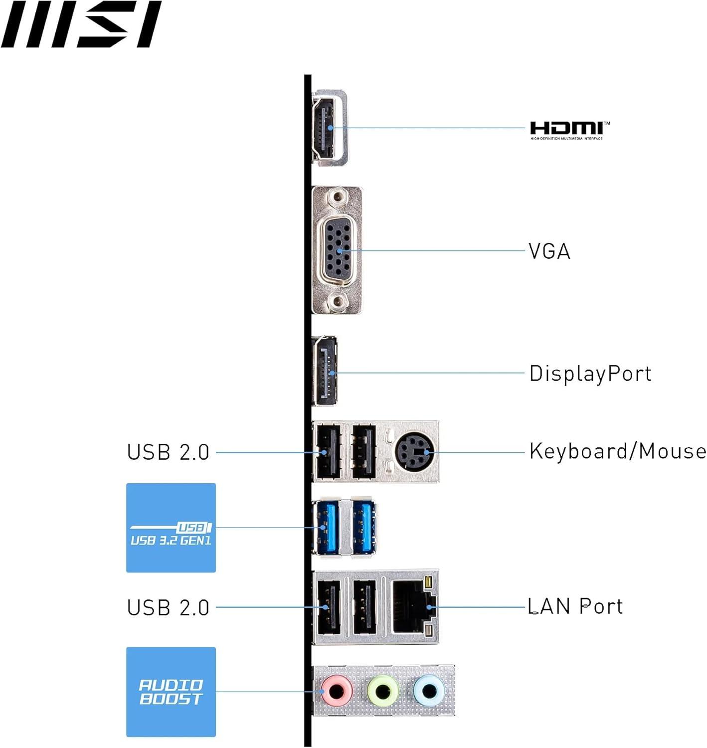 PRO H610M-G WIFI: Business Elegance Designed for value-oriented creative businesses employing the Intel H610 chipset (Intel Core 14th, 13th and 12th Gen Processors supported, LGA 1700), the MSI PRO H610M-G WIFI motherboard includes a primary PCIe 4.0 x16 graphics card slot (with Steel Armor), support for DDR5 memory modules (5600MHz), and M.2 Gen3 storage. With a fully digital VRM power design featuring Core Boost technology and augmented with passive & active – Frozr AI – cooling, the MSI PRO H610M-G WIFI is a business-oriented Micro-ATX motherboard that ensures reliable power delivery to Intel Core 14th, 13th and 12th Gen series desktop processors. Connectivity includes Wi-Fi 6E, 1G LAN, USB 5Gbps Type-A, HDMI 2.1 (4K/60Hz), DisplayPort 1.4, VGA display support, and 7.1 HD Audio. For professionals looking for dependable Intel Core 14th, 13th and 12th Gen processors performance with PCIe 4.0 x16 graphics card support, improved DDR5 memory support, and M.2 Gen3 storage, the MSI PRO H610M-G WIFI epitomizes business elegance.