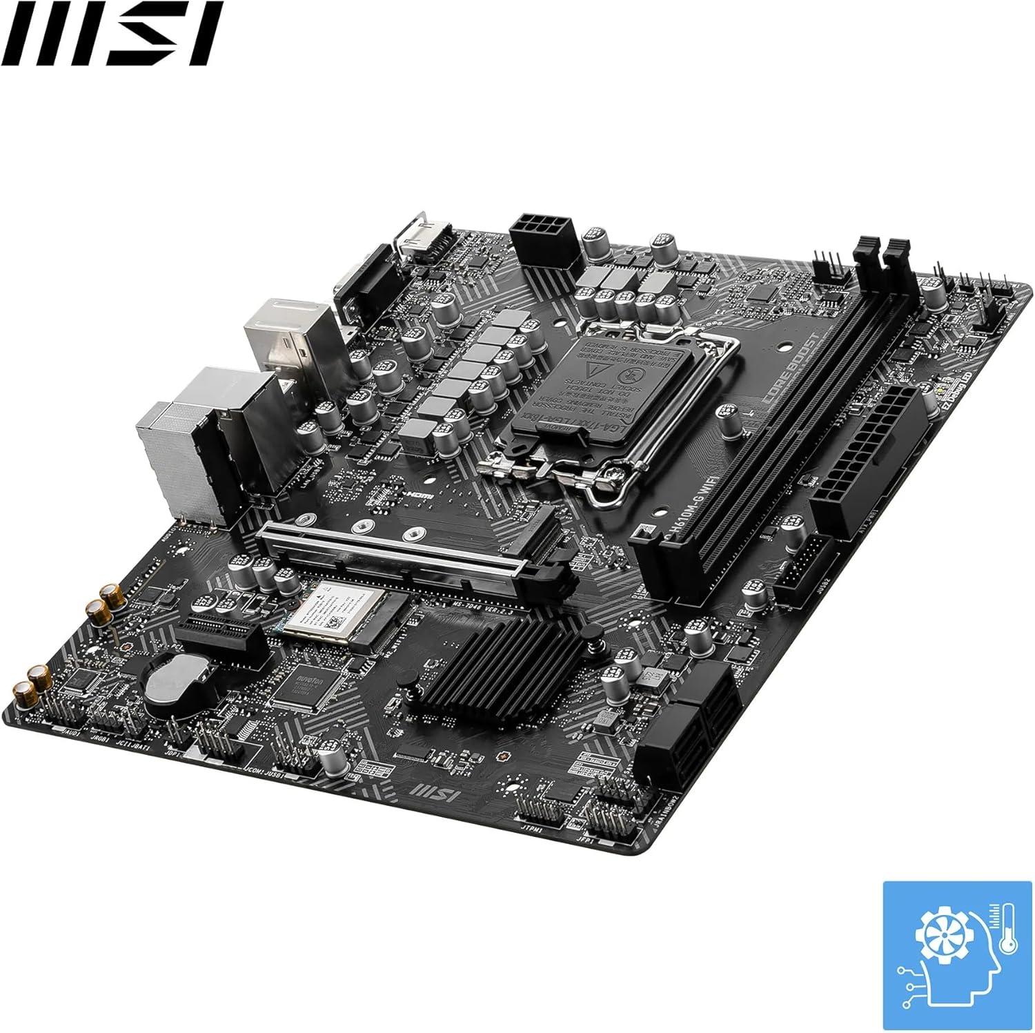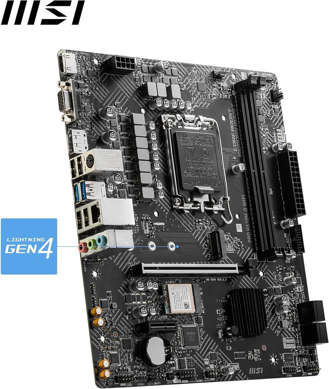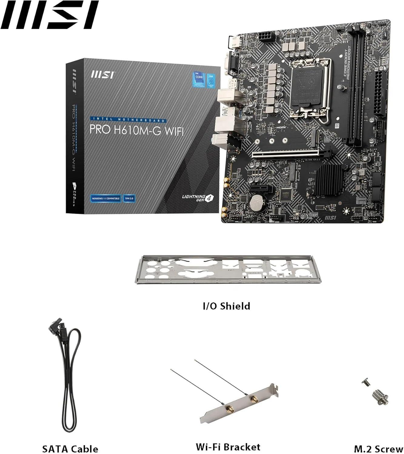 MSI PRO H610M-G WiFi Motherboard, Micro-ATX – Supports Intel Core 14th, 13th and 12th Gen Processors, LGA 1700 – DDR5 Memory Boost 5600MHz/MAX, PCIe 4.0 x16 Slot, M.2 Gen3 Slot, Wi-Fi 6E, BT 5.3